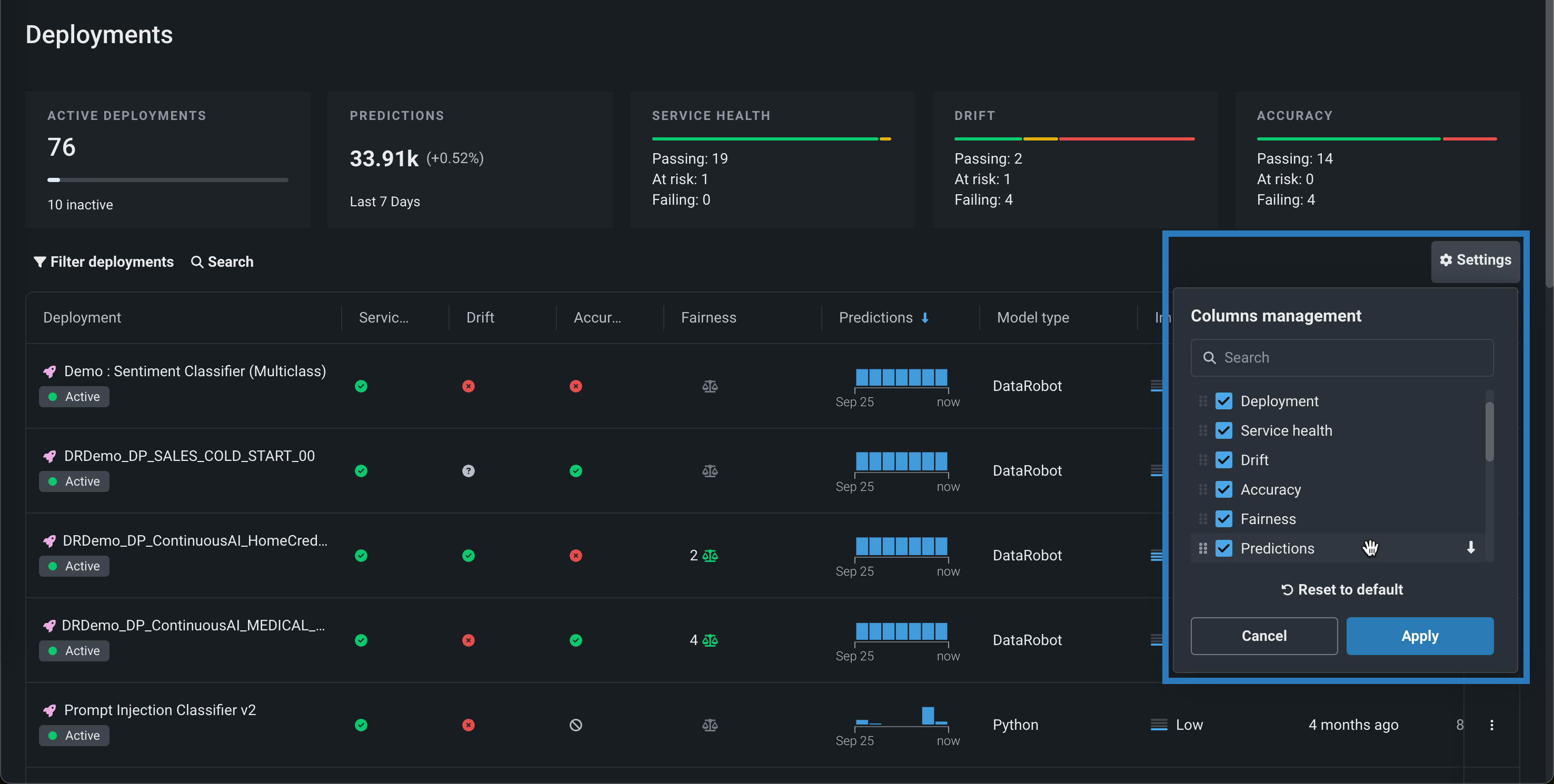 In addition, you can click Settings to configure the information displayed on the Deployments dashboard. In the Columns management menu, you can: