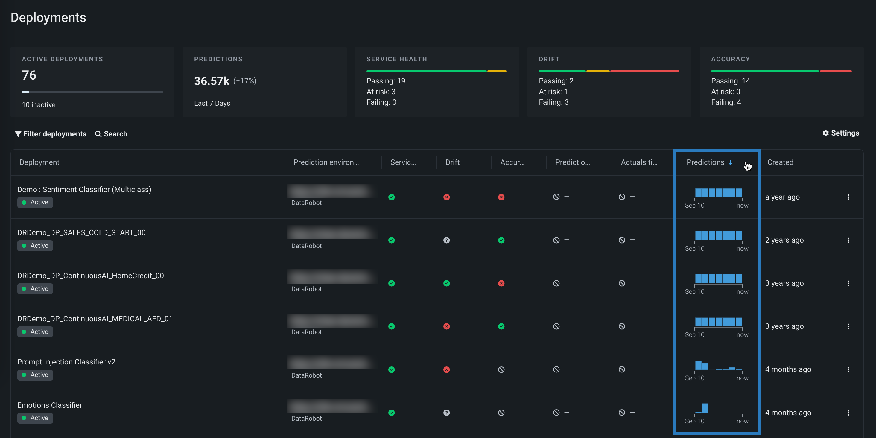 | Activation status | Filters by deployment activation status. Active deployments are able to monitor and return new predictions. Inactive deployments can only show insights and statistics about past predictions. |