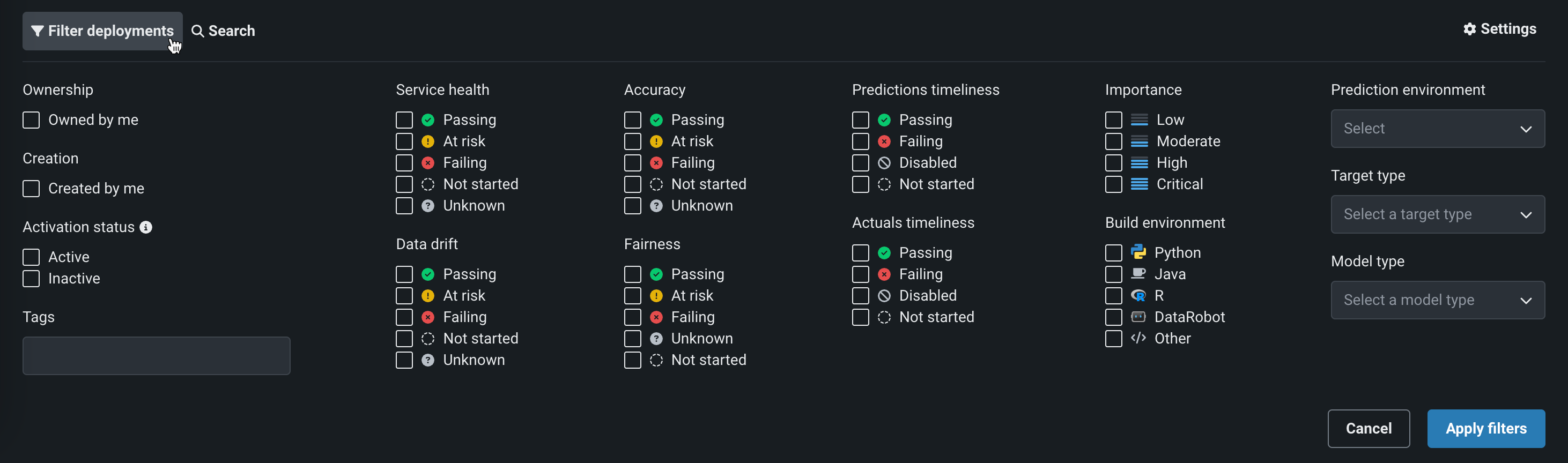 | Fairness | Filters by deployment fairness status. Choose to filter by passing , at risk , failing , unknown , and not started . |