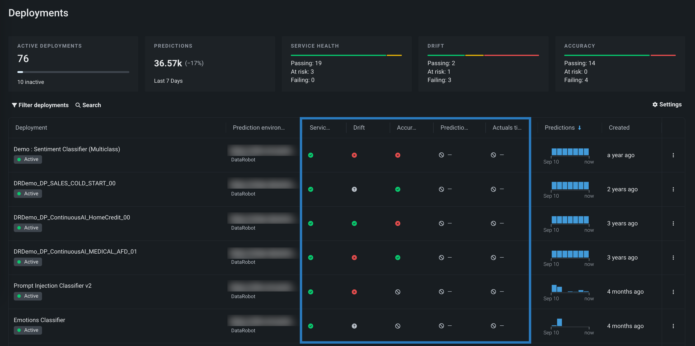 | Accuracy | Filters by deployment accuracy status. Choose to filter by passing , at risk , failing , unknown , and not started . If a deployment does not have accuracy information available, it is excluded from results when you apply the filter. |
