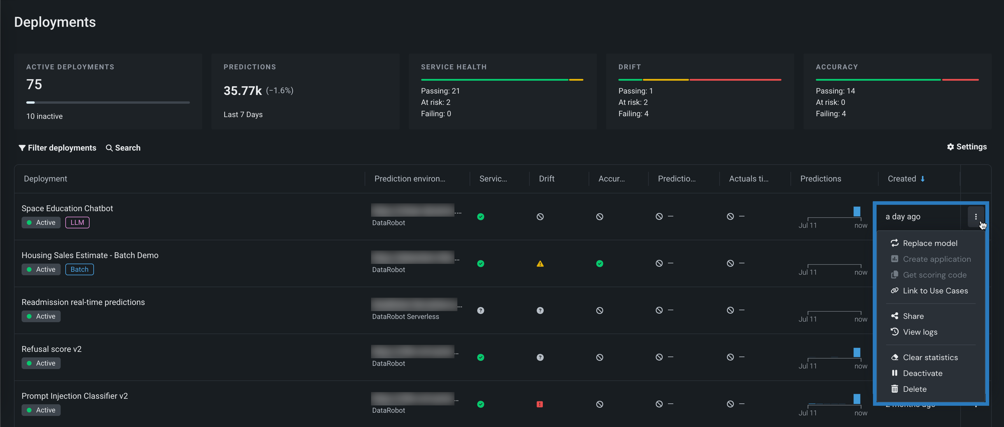Or, click the row in the table to open the deployment Overview, where you can view deployment information and access the actions menu.
