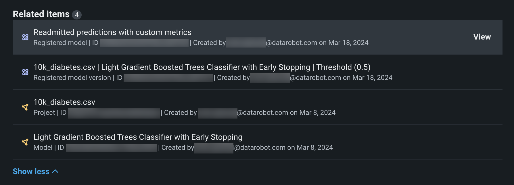 The Related items section contains a list of the assets associated with a deployment. Depending on the currently deployed model, you can see different related items. Click Show more to reveal all related items: