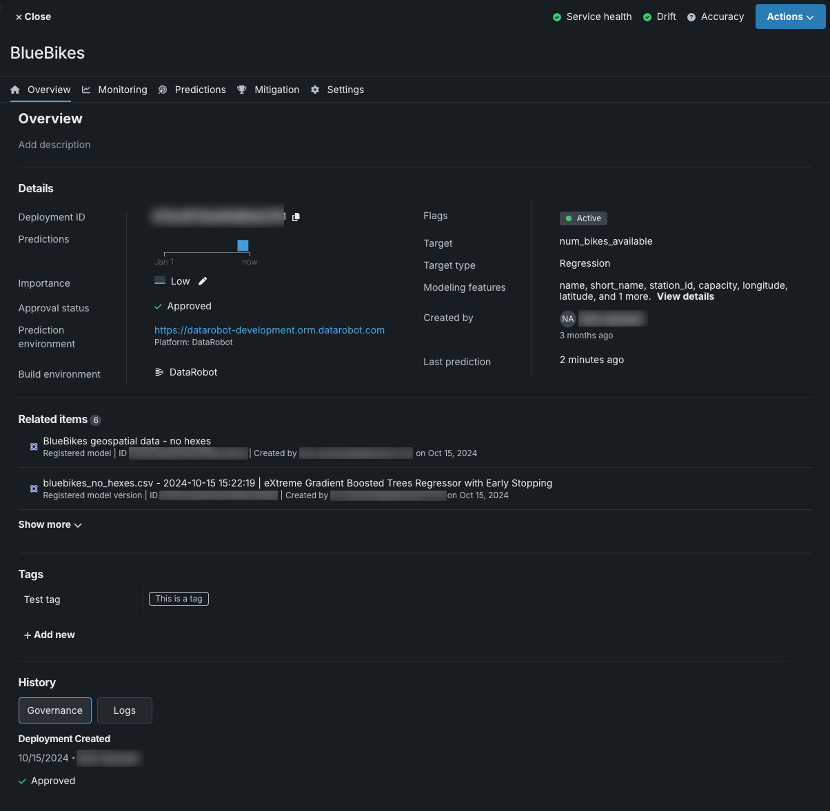 | Model | The name and ID of the deployment's current model. Click to open the model blueprint. You can view the Model ID of any models deployed in the past from the deployment logs (History > Logs). |