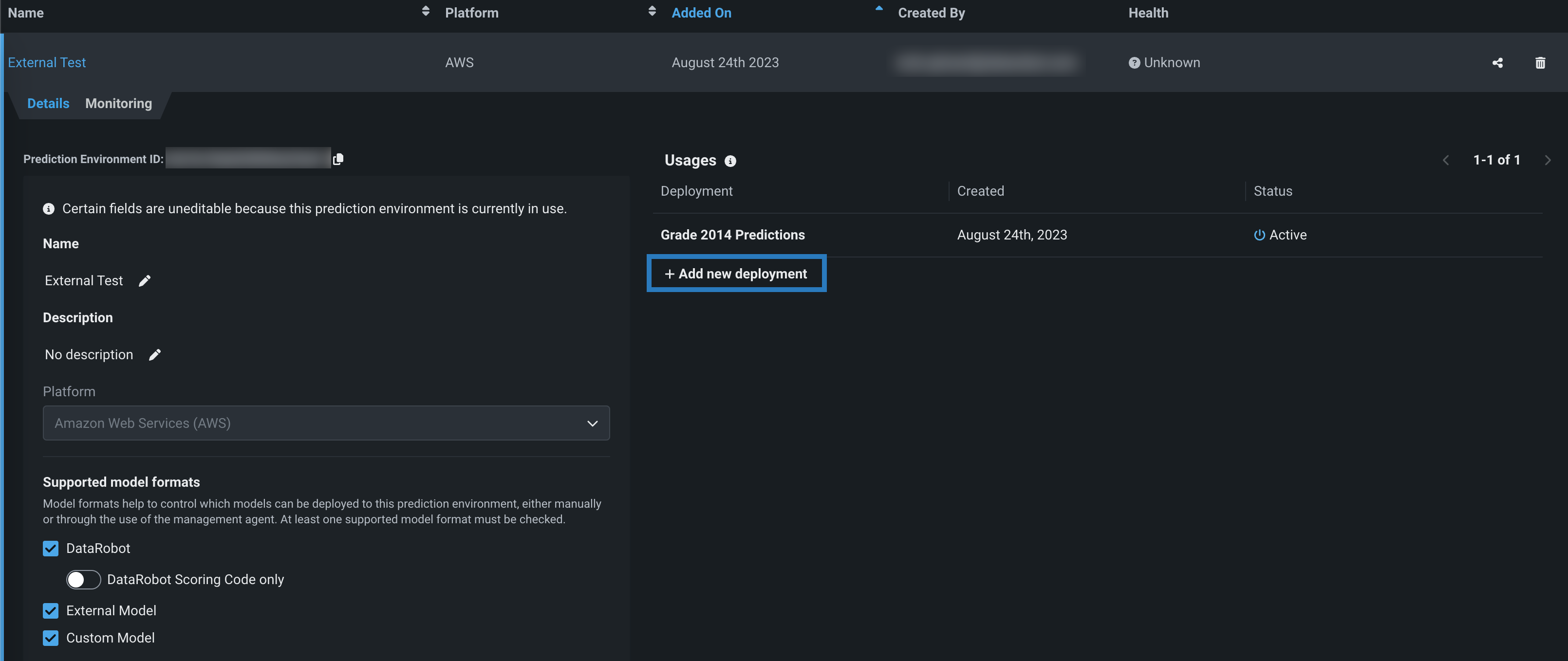 From the Prediction environments page, you can deploy a model directly to any prediction environment, DataRobot or external.
