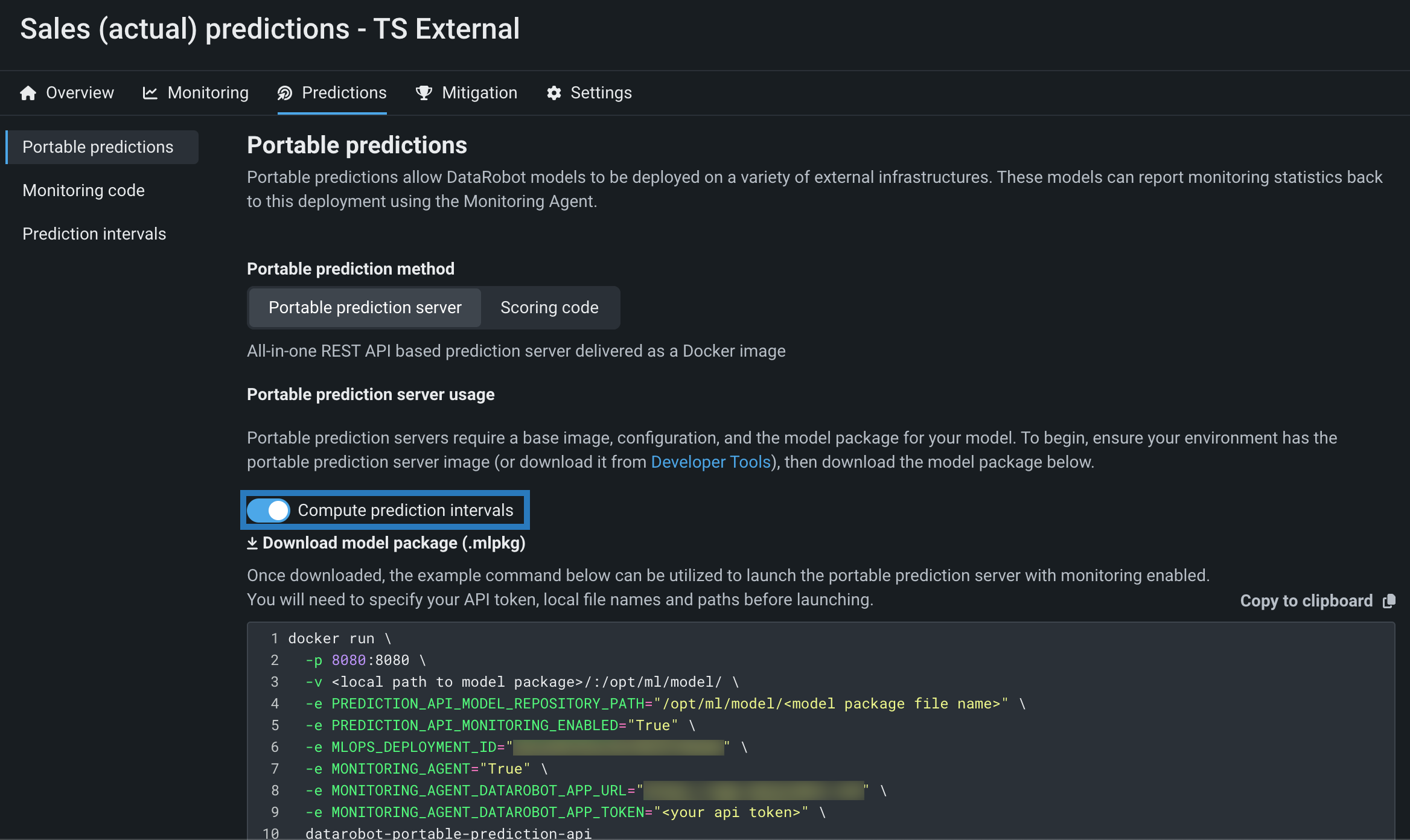 | 4 | Docker snippet | After you download your model package, use the Docker snippet to launch the Portable Prediction Server for the model with monitoring enabled. You will need to specify your API key, local filenames, paths, and monitoring options before launching. |