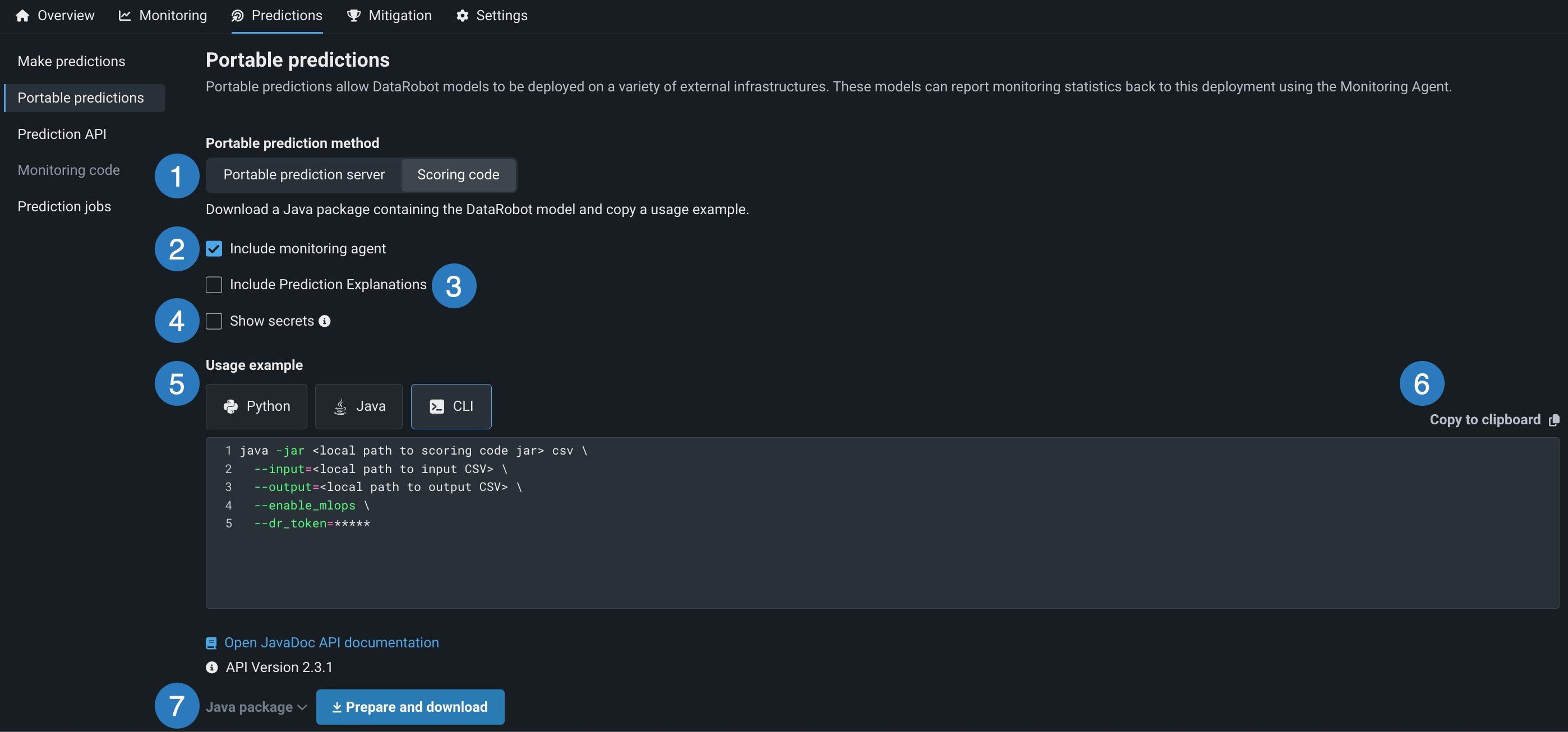 | 1 | Scoring Code | Provides a Java package containing your DataRobot model. Under Portable prediction method, select Scoring Code. |