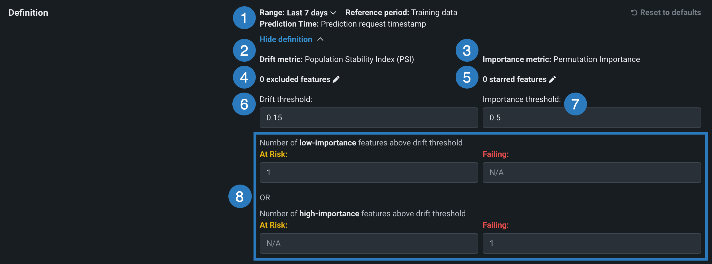 | 8 | "At Risk" / "Failing" thresholds | Configures the values that trigger drift statuses for "At Risk" ( |