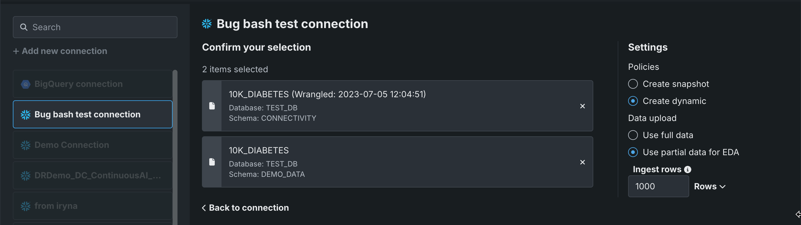 Setting Description Upload full data Instructs DataRobot to take a snapshot of the full dataset. Upload data partially Instructs DataRobot to take a snapshot using the first N number of rows for registration. You must specify the number of ingest rows.