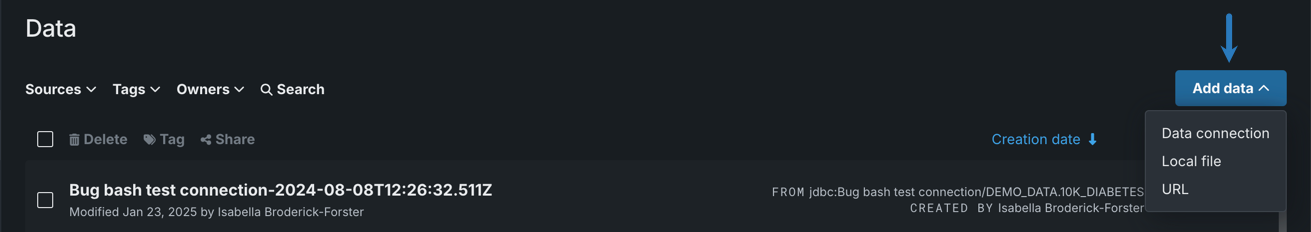 To add data from the Data Registry, click the Add data dropdown and select one of the following methods: