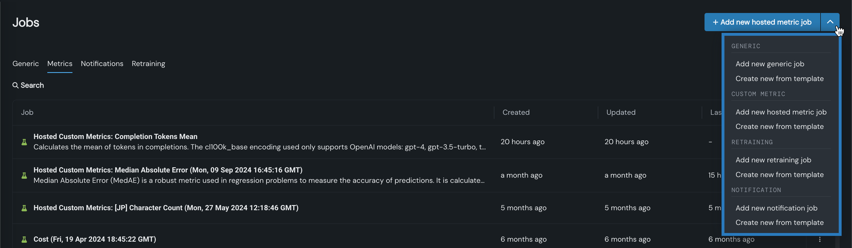 | Create new from template | Add a job for a hosted metric from a template provided by DataRobot, associating the metric with a deployment and setting a baseline. |