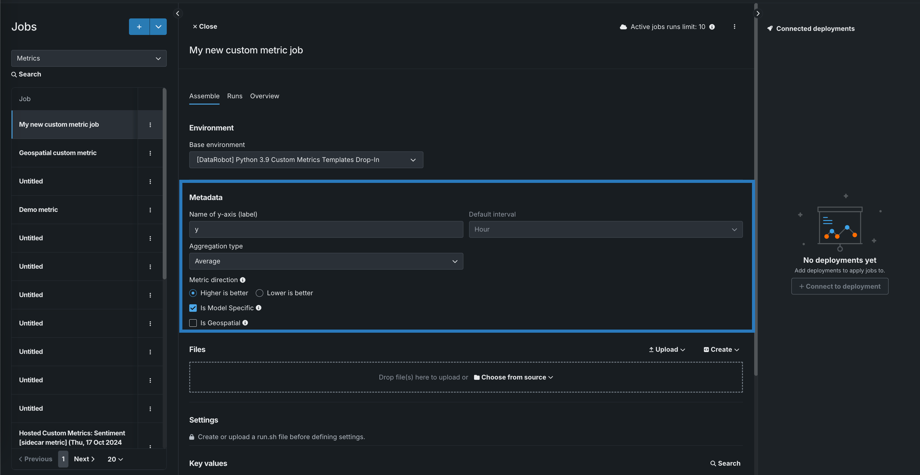 On the Assemble tab, you can optionally modify the template's default name, Environment, Files, Settings, Resources, Runtime Parameters, or Key values, just as with a standard custom metric job.