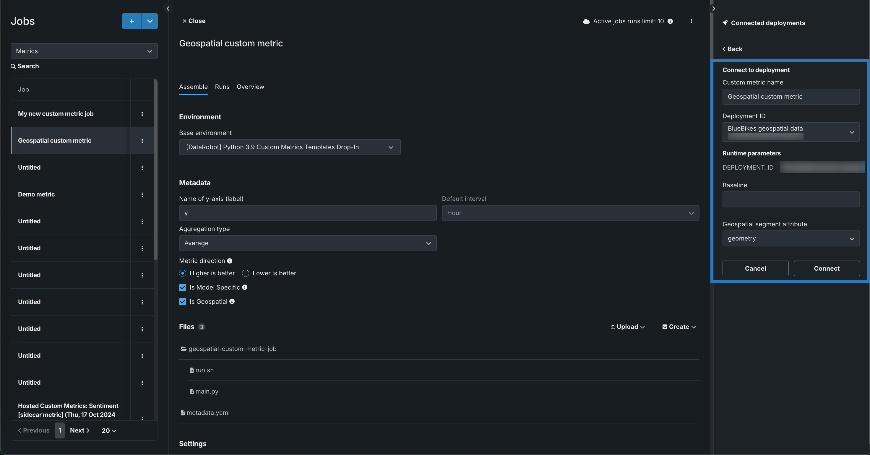After you connect a deployment to a hosted custom metric job and schedule a run, you can't modify the