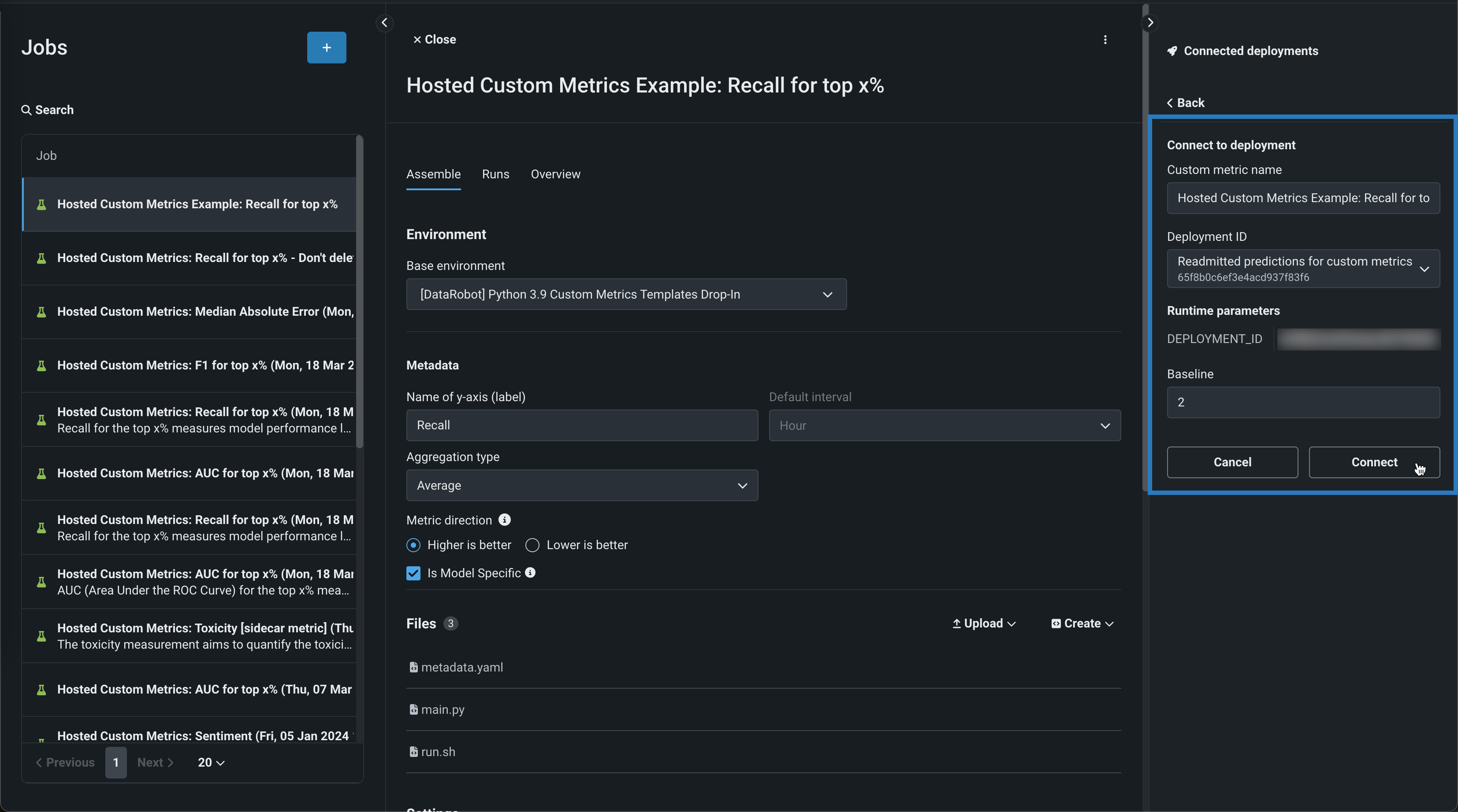 In the Connected deployments panel, click + Connect to deployment, define a Custom metric name, and select a Deployment ID to connect it to that deployment.