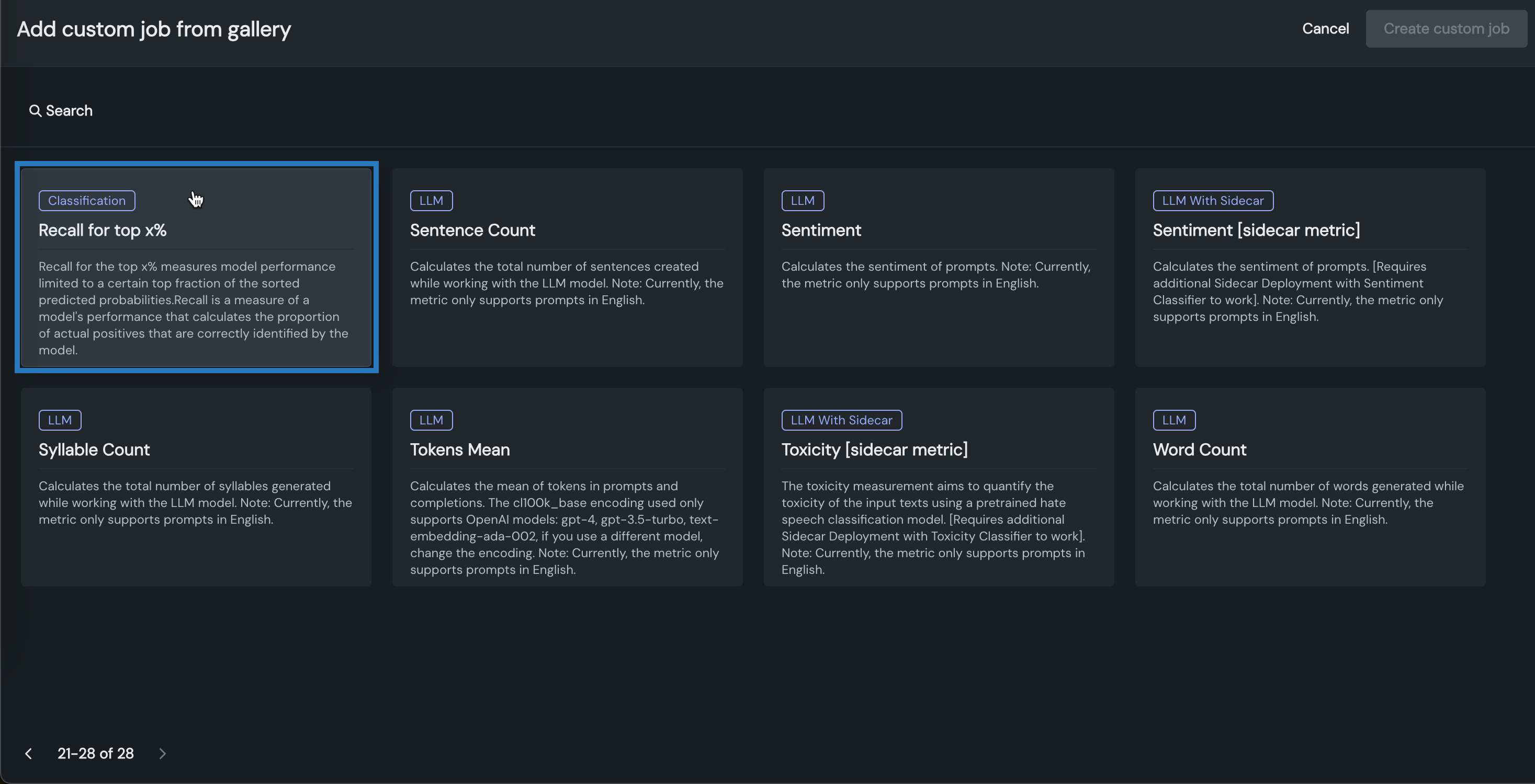 In the Add custom job from gallery panel, select a custom metric template applicable to your intended use case and click Create metric.