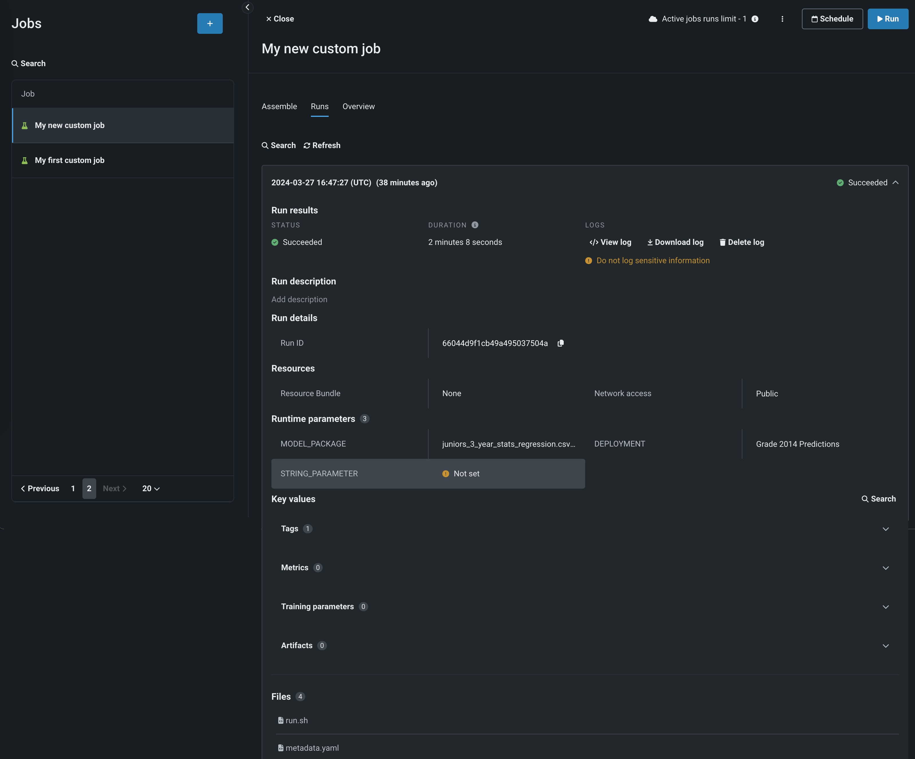 When you run a custom job (or a scheduled run completes), the run information is recorded, allowing you to review the run information and view and manage run logs. This is helpful for diagnosing issues when a run fails.