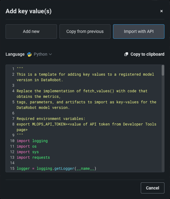 model.versionis not overwritten in a newer version with the old version's value.To import key values through the API, click Copy to clipboard to copy the Python code snippet for importing key values: