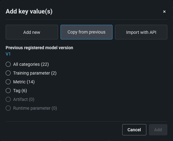 Description (Optional) Enter a description of the key value's purpose. To copy key values from a previous registered model version, select All categories or a single category, and then click Add to copy the key values: