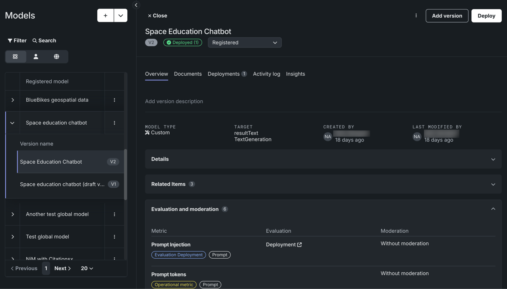 When a text generation model with guardrails is registered and deployed, you can view the configured guardrails on the registered model's Overview tab and the deployment's Overview tab: