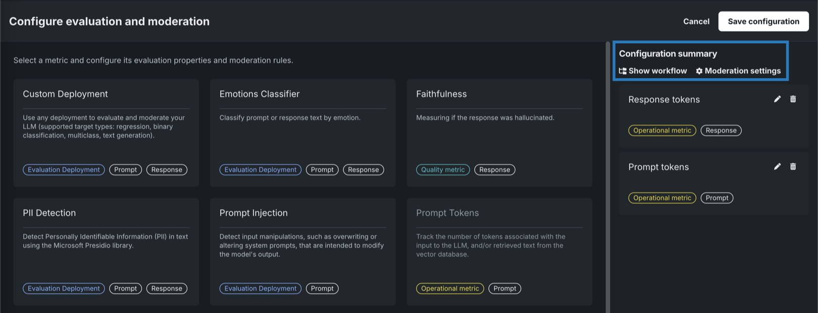 In the Configure evaluation and moderation panel, click one of the following metric cards to configure the required properties: