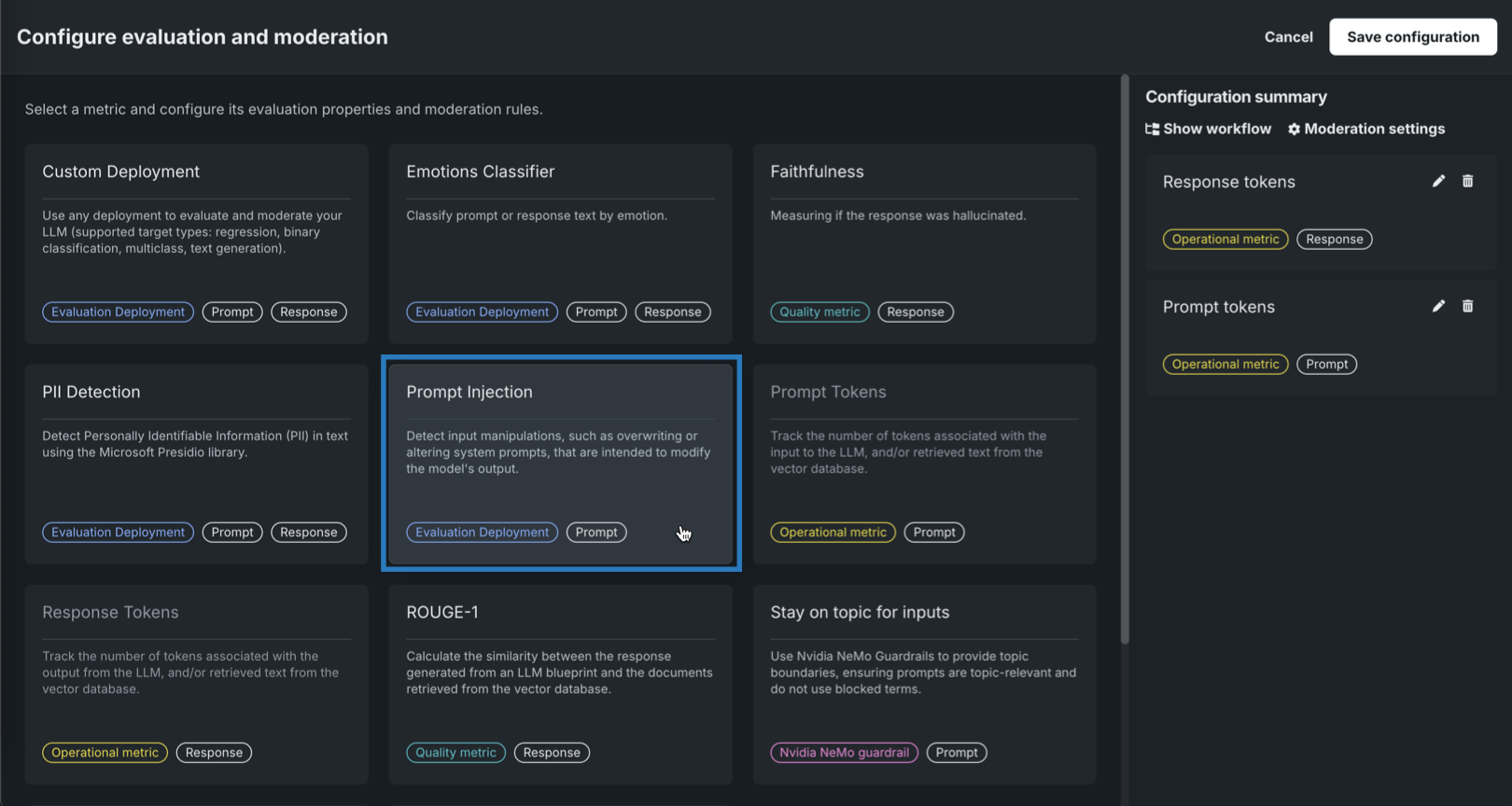 Evaluation metric Requires Description Custom Deployment Custom deployment Use any deployment to evaluate and moderate your LLM (supported target types: regression, binary classification, multiclass, text generation). Emotions Classifier Emotions Classifier deployment Classify prompt or response text by emotion. Faithfulness Playground LLM, vector database Measure if the LLM response matches the source to identify possible hallucinations. PII Detection Presidio PII Detection Detect Personally Identifiable Information (PII) in text using the Microsoft Presidio library. Prompt Injection Prompt Injection Classifier Detect input manipulations, such as overwriting or altering system prompts, intended to modify the model's output. Prompt tokens N/A Tracks the number of tokens associated with the input to the LLM. Response tokens N/A Tracks the number of tokens associated with the output from the LLM. Rouge 1 Vector database Calculate the similarity between the response generated from an LLM blueprint and the documents retrieved from the vector database. Stay on topic for inputs NVIDIA NeMo guardrails configuration Use NVIDIA NeMo Guardrails to provide topic boundaries, ensuring prompts are topic-relevant and do not use blocked terms. Stay on topic for output NVIDIA NeMo guardrails configuration Use NVIDIA NeMo Guardrails to provide topic boundaries, ensuring responses are topic-relevant and do not use blocked terms. Token Count N/A Track the number of tokens associated with the input to the LLM, output from the LLM, and/or retrieved text from the vector database. Toxicity Toxicity Classifier Classify content toxicity to apply moderation techniques, safeguarding against dissemination of harmful content. The deployments required for PII detection, prompt injection detection, emotion classification, and toxicity classification are available as global models in the registry.
