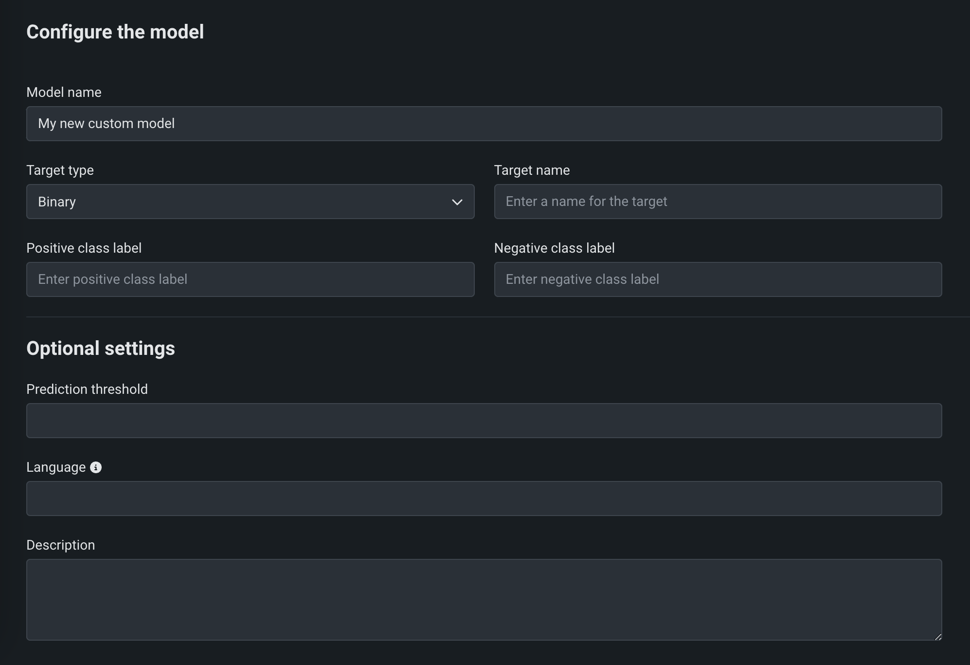 Field Description Model name A descriptive name for the custom model. Target type The type of prediction the model makes. Depending on the prediction type, you must configure additional settings: - Binary: For a binary classification model, enter the Positive class label and the Negative class label.