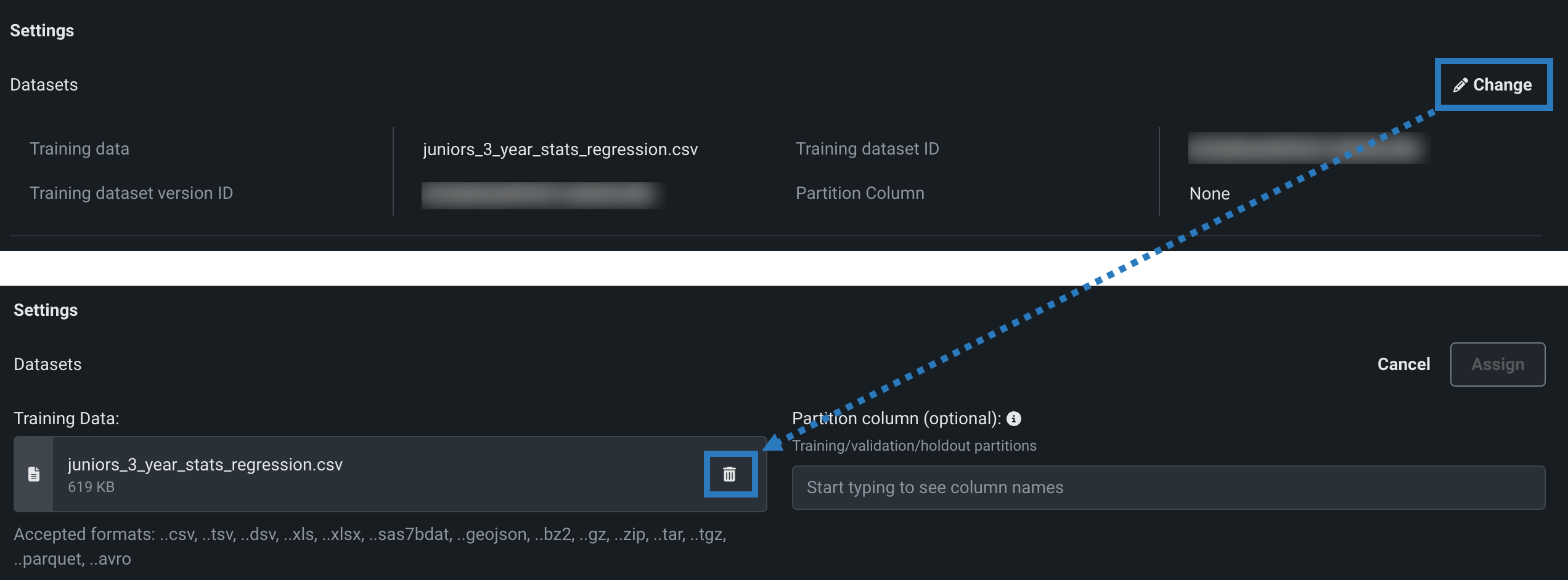 If the model version does have training data assigned, click () Change, and then, under Training Data, click the delete () icon to remove the existing training data.