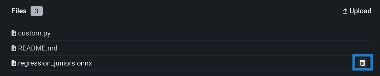 Element Description 1 Files Drag files into the group box for upload. 2 Choose from source Click to browse for Local Files or a Local Folder. To pull files from a remote repository, use the Upload menu. 3 Upload Click to browse for Local Files or a Local Folder or to pull files from a remote repository. 4 Create Create a new file, empty or as a template, and save it to the custom model: - Create model-metadata.yaml: Creates a basic, editable example of a runtime parameters file.