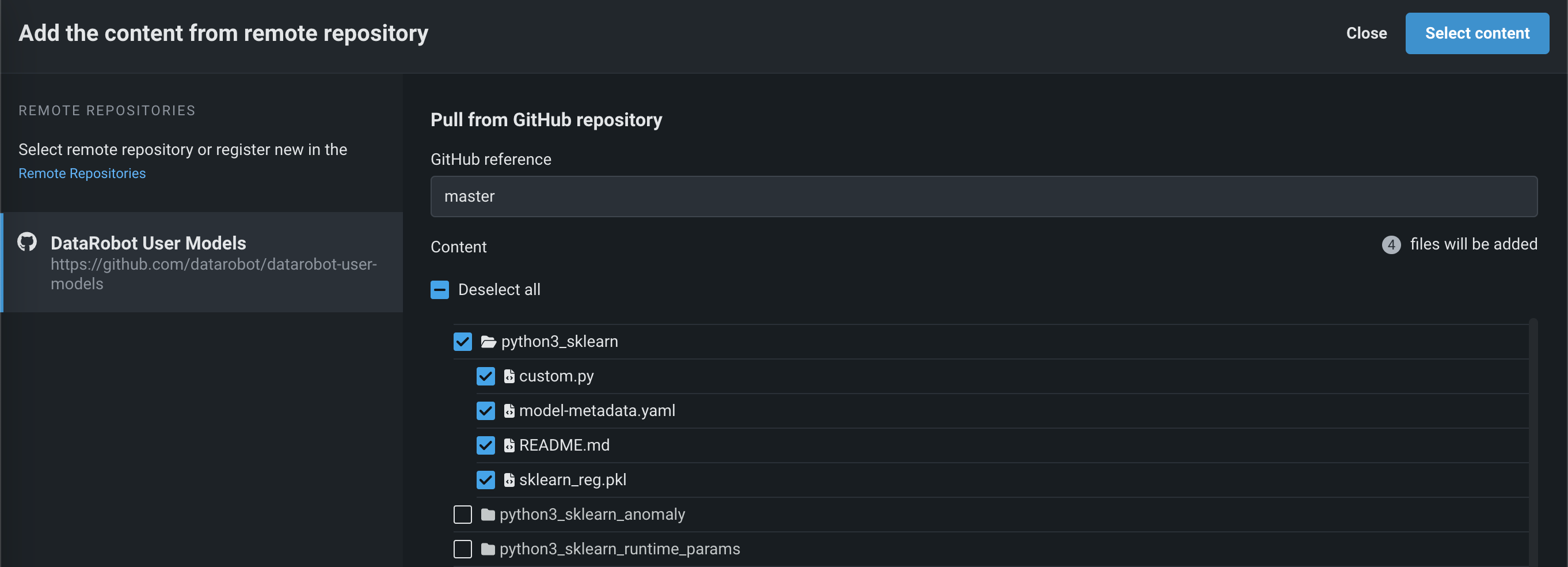 After registering and selecting a repository, you can select the checkbox for each file or folder you want to upload, and then click Select content: