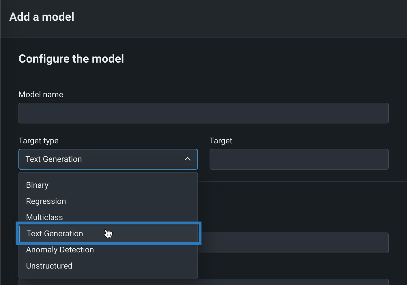 To create a custom LLM, in the model workshop, create a new custom text generation model. Set the Target type to Text Generation and define the Target.