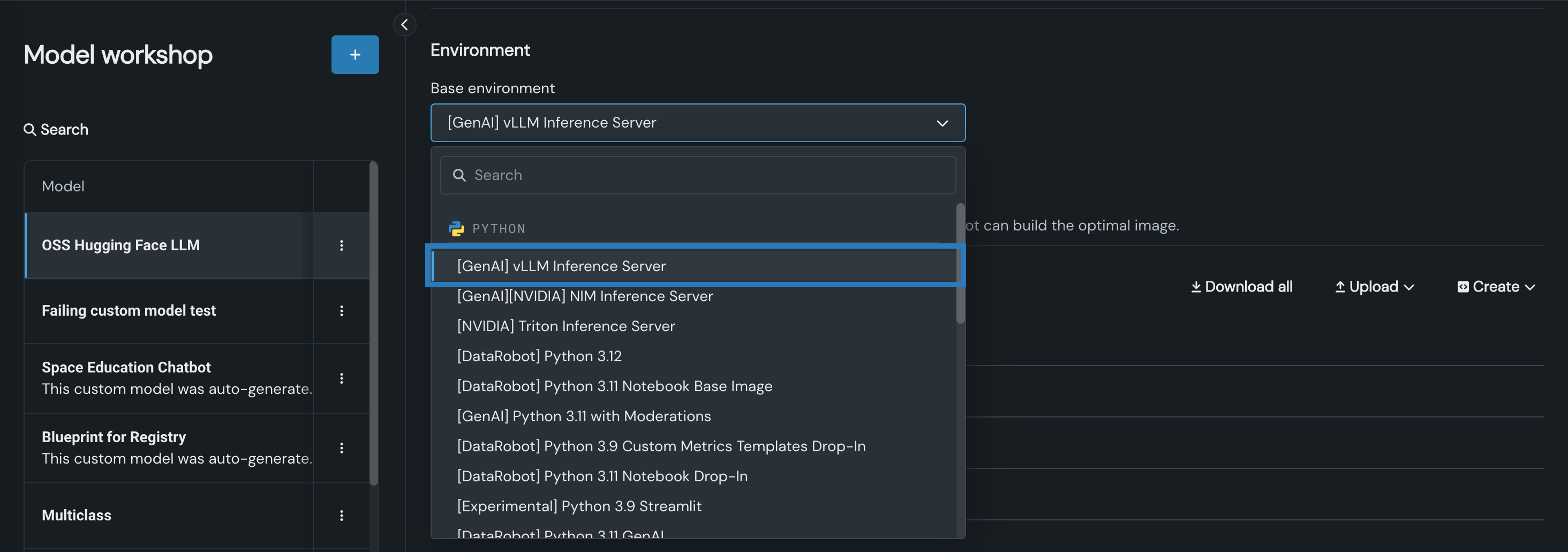 If the GenAI vLLM Inference Server environment isn't available in the Base environment list, you can add a custom environment using the resources provided in the DRUM repository's public_dropin_gpu_environments/vllm directory.