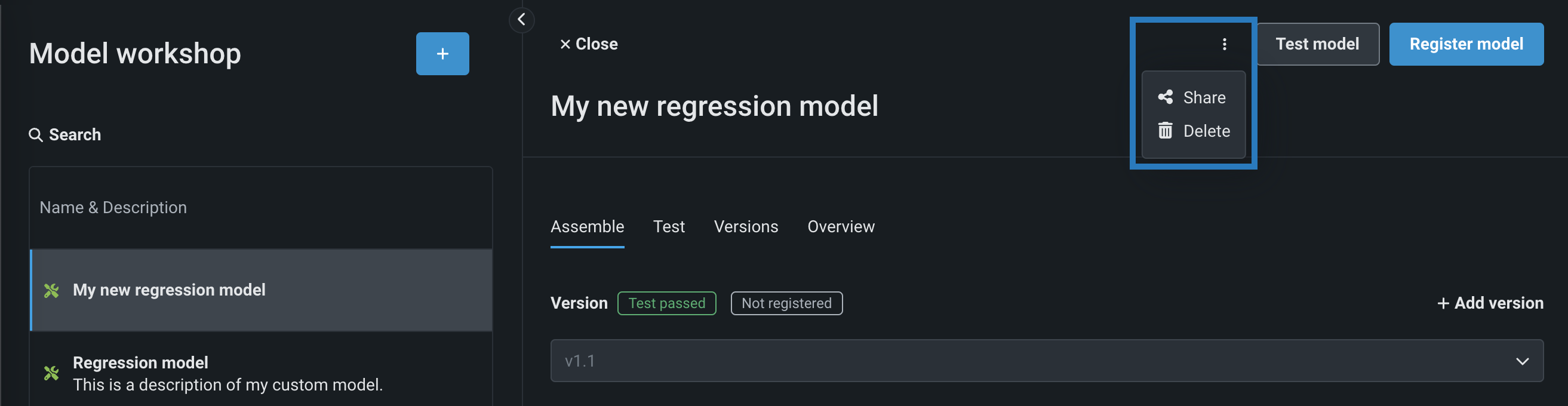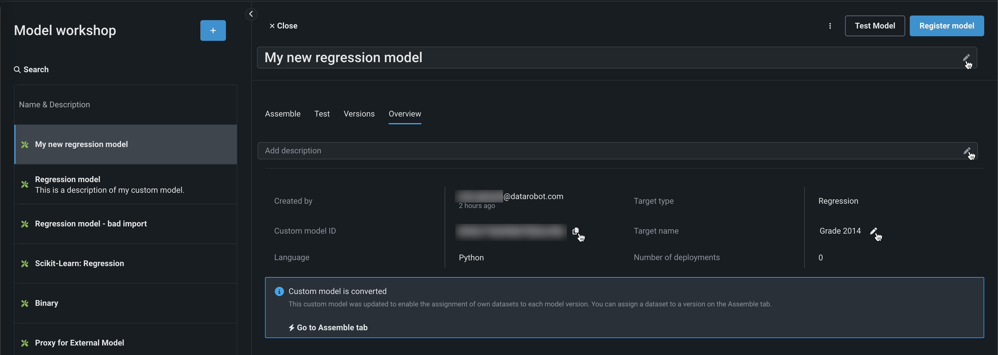 In the Model workshop, you can view basic custom model information and review the information you provided when you created the model. In addition, you can perform management actions such as model sharing and deletion.