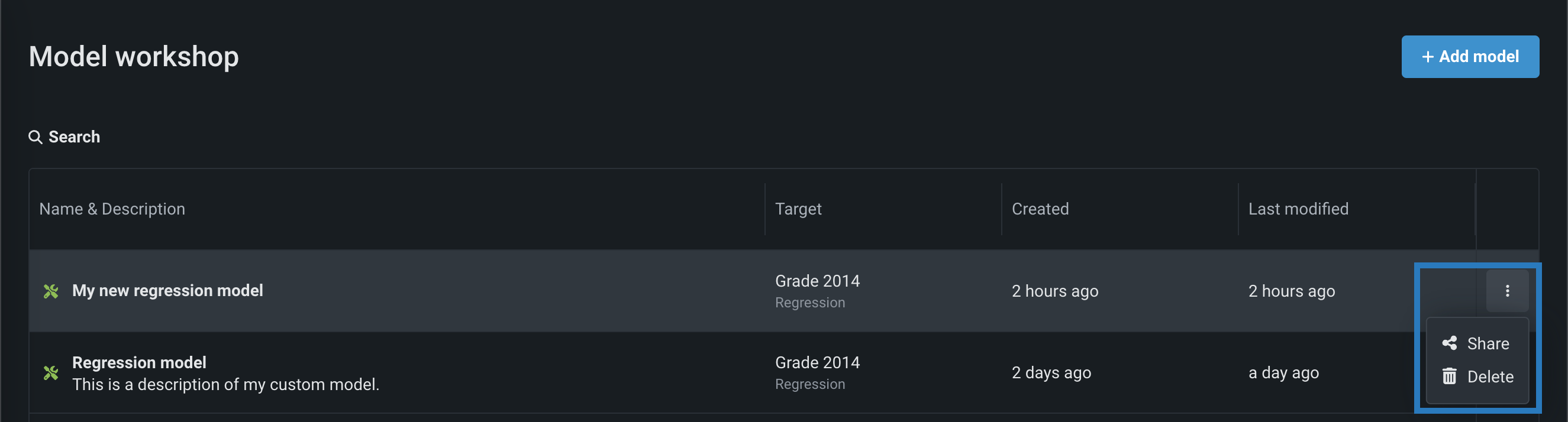 When the custom model panel is closed, in the actions menu located in the last column for each custom model in the Model workshop, use the Share option to grant (or revoke) permissions to a custom model: