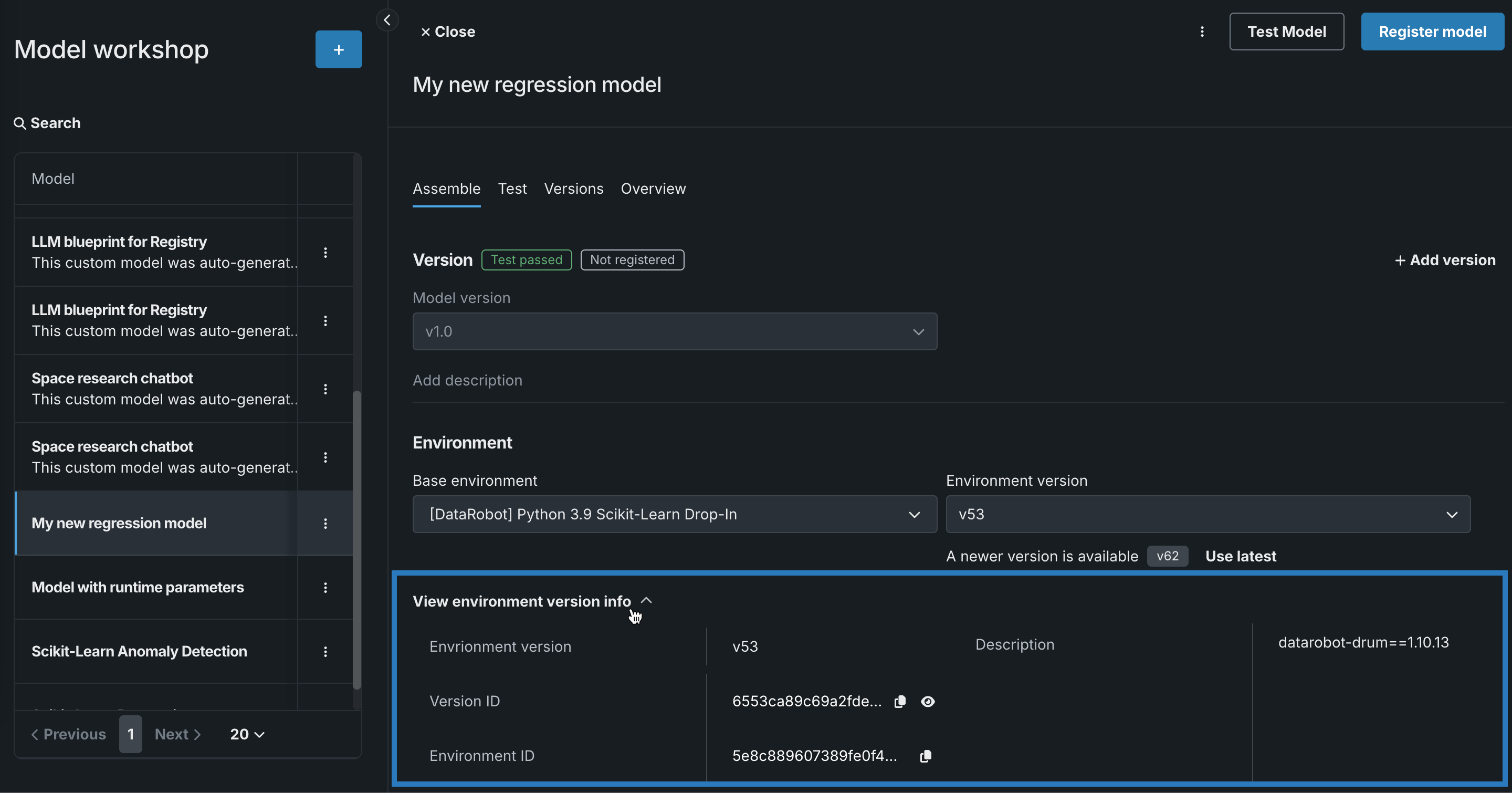 To view more information about the custom model's current environment version, click View environment version info to view the Environment version, Version ID, Environment ID, and Description.