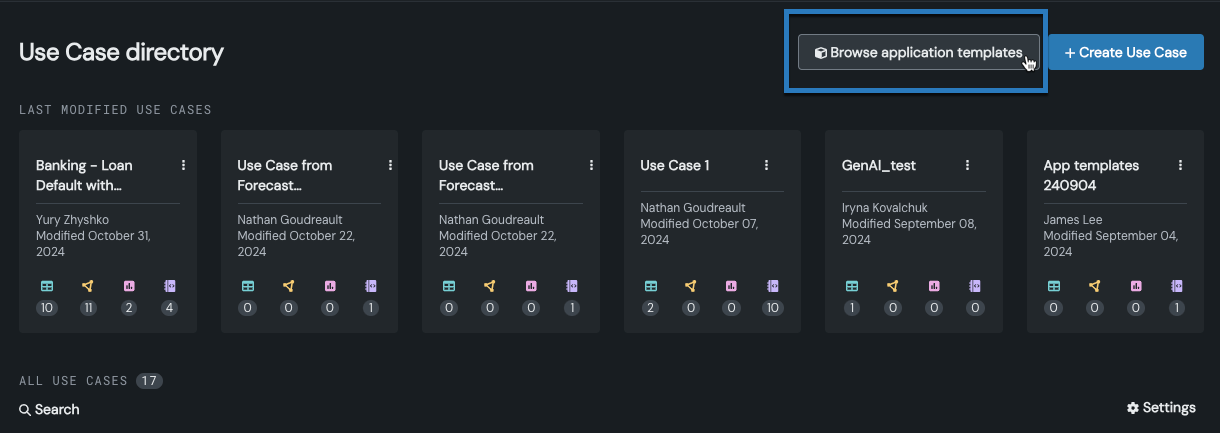 From the Workbench home page or Use Case directory, click Browse application templates to open the Application Gallery.