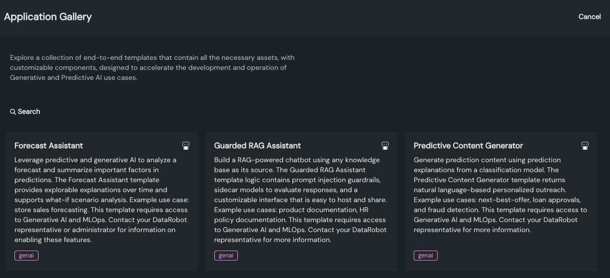 The Application Gallery displays the collection of available templates and provides a brief description of each. While the descriptions list example uses cases, each template can be applied to a variety of use case types.