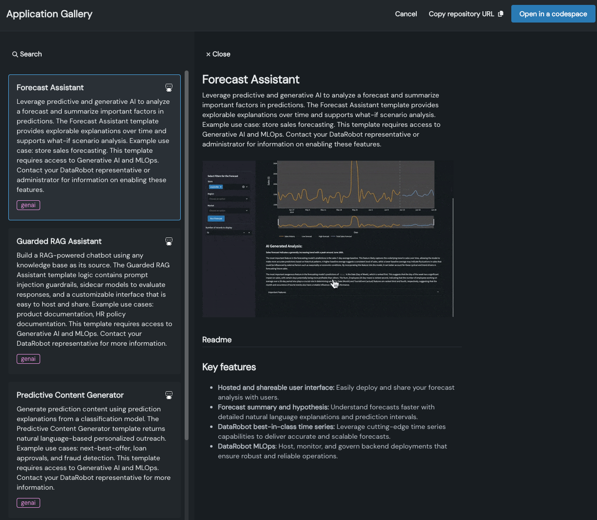 Once you have selected an application template, click Open in a codespace. DataRobot then: