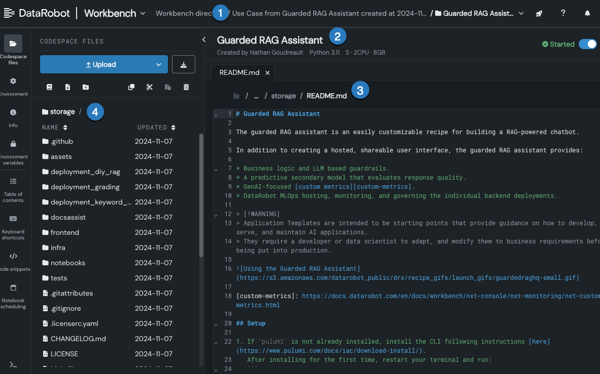 Element Description 1 Use Case The Use Case that was created from the template. Click in the breadcrumbs to view the Use Case in the directory. 2 Codespace title The name of the codespace created in a Use Case for the application template 3 The template README The README file for the application template. It outlines steps for the local development workflow and critical steps for the codespace workflow that are slightly different (detailed in the "Setup for advanced users" section). 4 File browser The codespace's file browser lists all of the files that are part of the application template. Use the browser to navigate to and open the README and notebooks executing the template's code. How you work with an application template depends on where you work with it: