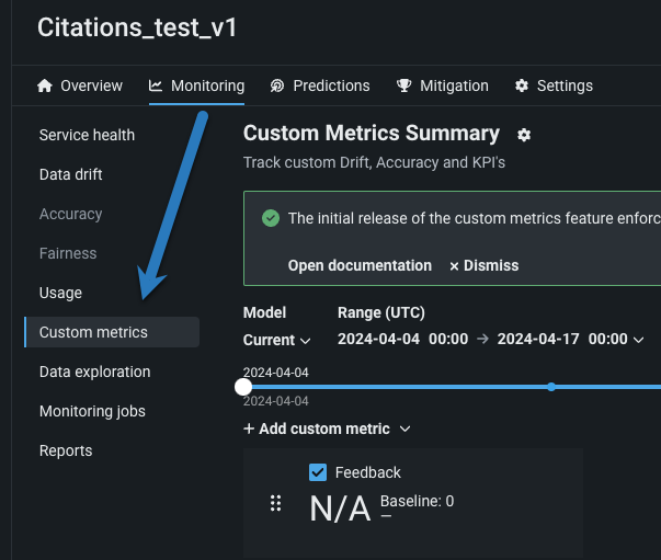 Additionally, set up an association ID for the deployment in order to store submitted feedback (via the custom metric) with the associated prompt and response data. Without an association ID, the feedback custom metric is only able to store responses aggregated by time values.