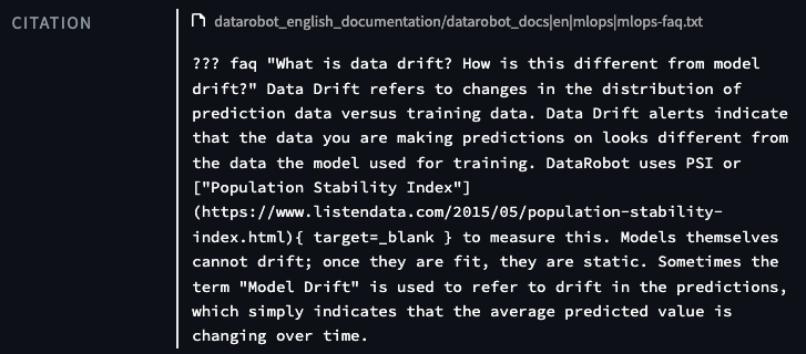 Additionally, click Citations to view a dialog box that details the source(s) from which the application finds its answer to the prompt.