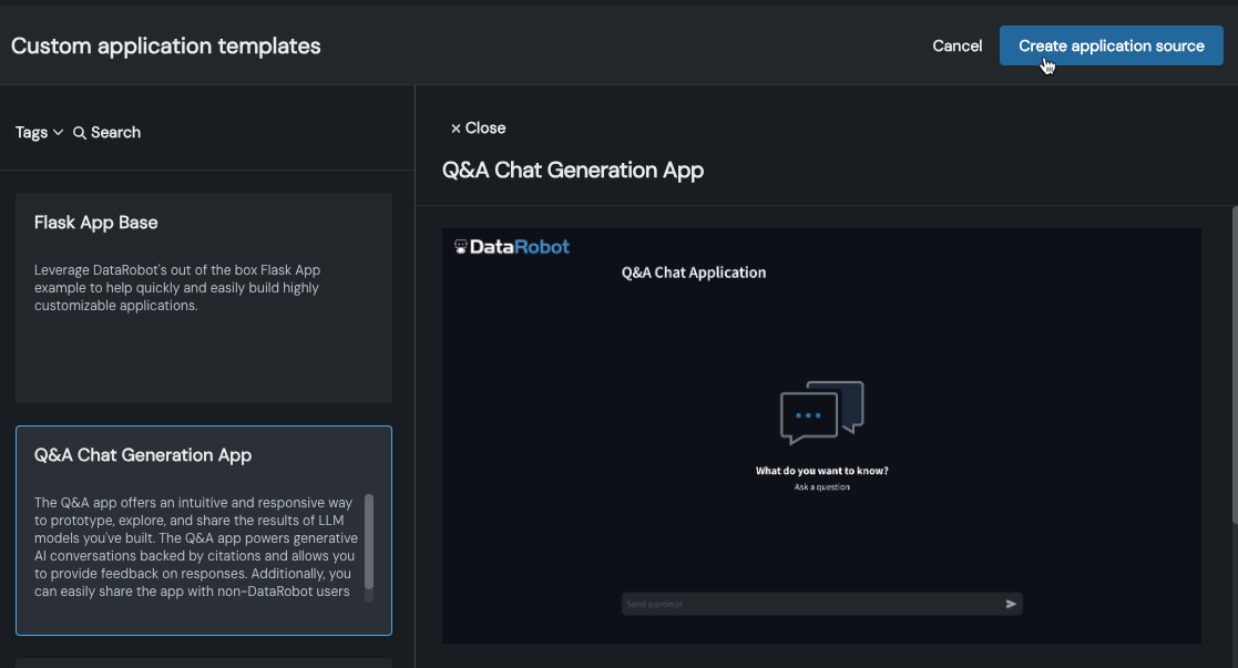 From the template gallery, select the Q&A Chat Generation App template, and then click Create application source.