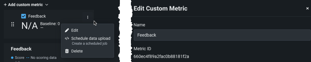 After configuring the deployment with the appropriate custom metrics, note the deployment ID and custom metric ID. They are be used to build the chat generation Q&A application. To locate the custom metric ID, select the Actions menu on the configured custom metric in the deployment and click Edit. The dialog box lists the metric ID.