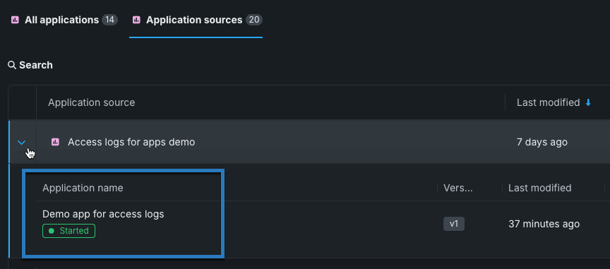 You can also view access logs directly from an application source. Navigate to the Application sources page, locate the application source for your custom application, and expand the dropdown to view the applications built from the source. Then you can click the custom application for which you want to view the access logs to access a detailed view.