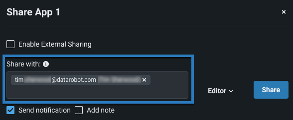 The sharing capability allows you to manage permissions and share an application with users, groups, and organizations, as well as recipients outside of DataRobot. This is useful, for example, for allowing others to use your application without requiring them to have the expertise to create one.
