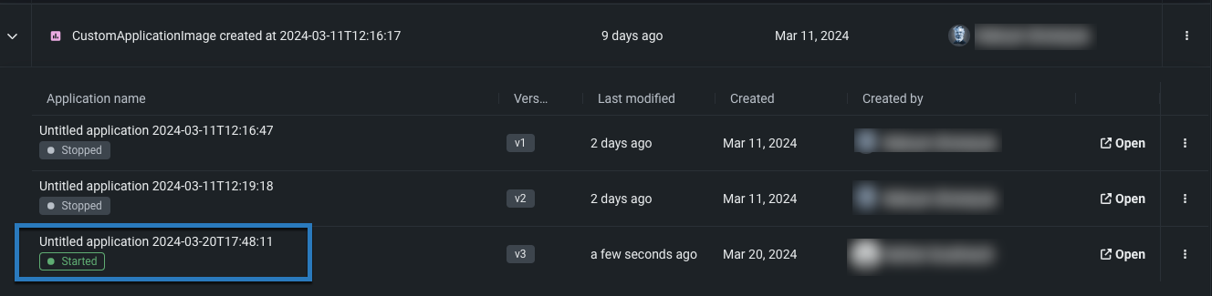 The custom app is added to the list of apps built from that source. After it builds, you can click Open to view the application.