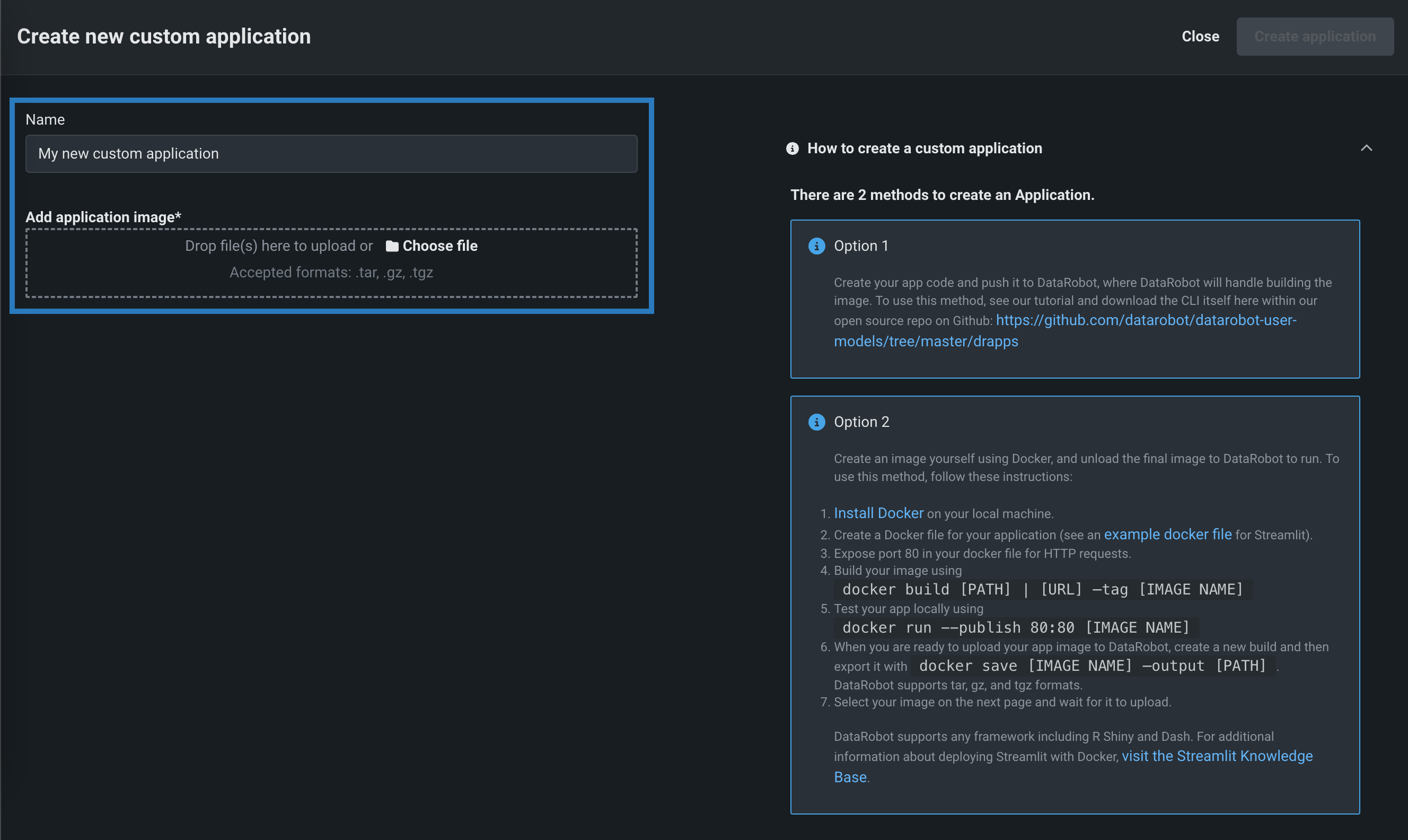 Custom application upload from a pre-built image is a premium feature. Contact your DataRobot representative or administrator for information on enabling the feature.