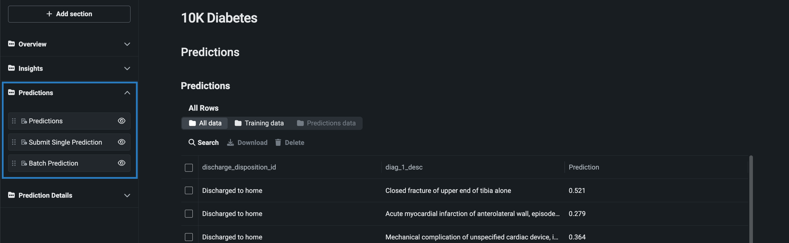The Predictions folder allows you to make single record and batch predictions, as well as, view a history of predictions made in the application.