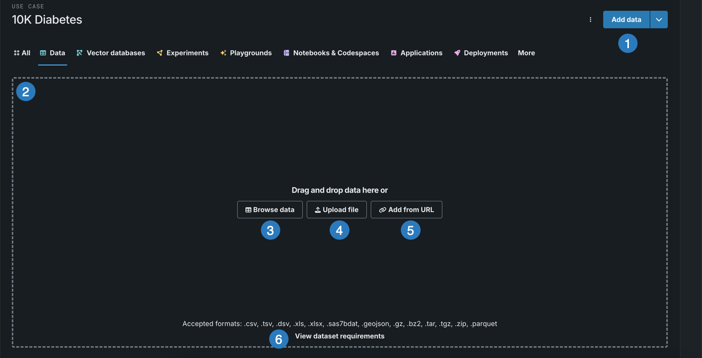 | 2 | Drag-and-drop | Drag-and-drop one or more datasets within the dotted lines to add them to the Use Case. See the accepted formats listed above View dataset requirements. |