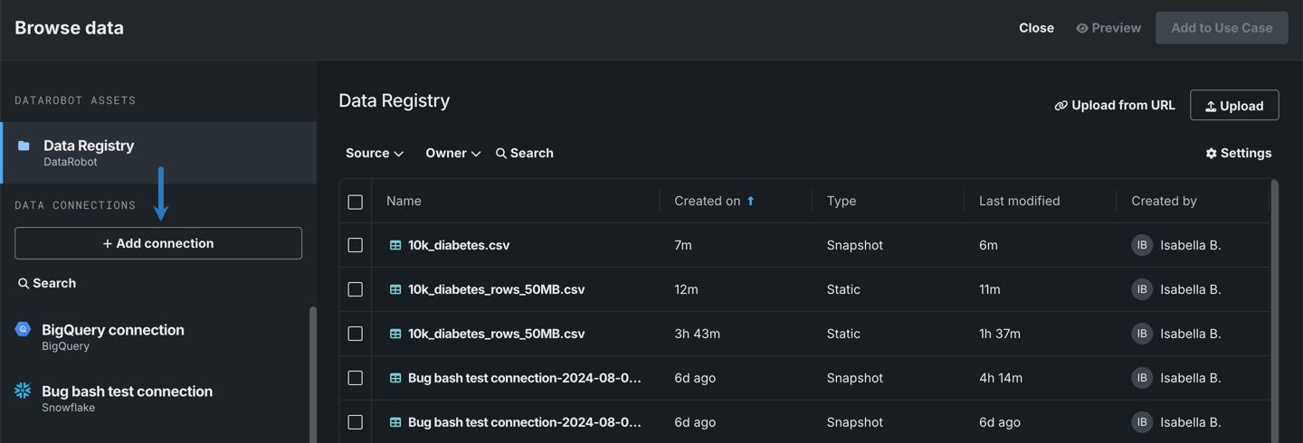 Creating a data connection lets you explore external source data and then add it to your Use Case.