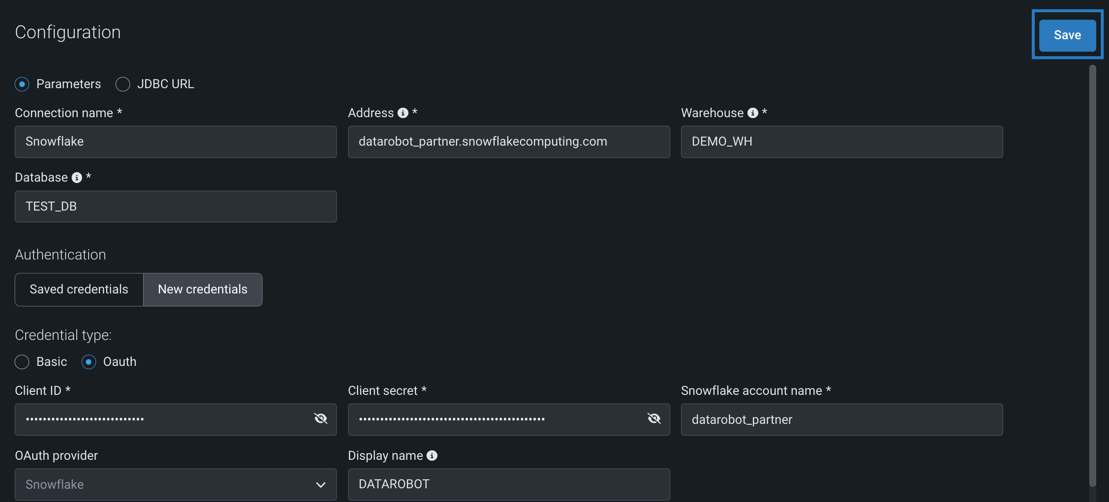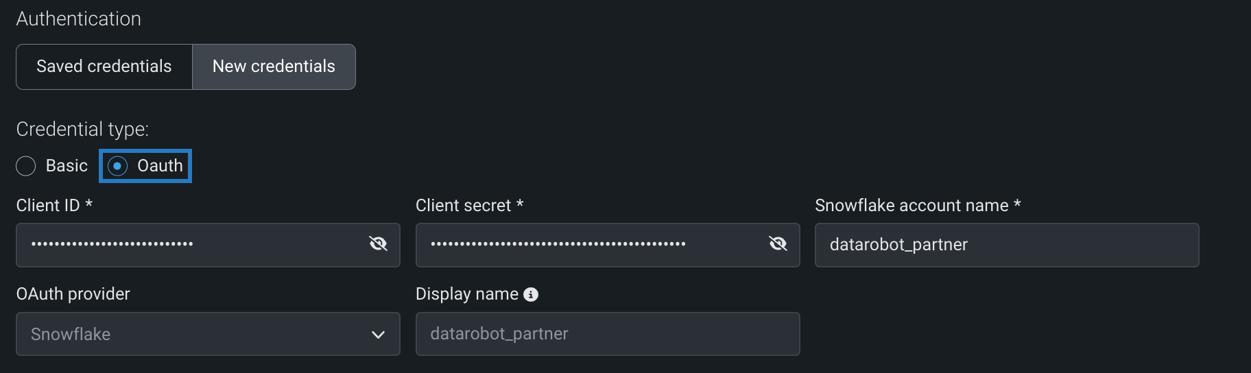 When configuring your data connection, configuration types, authentication options, and required parameters are based on the selected data source. The example below shows how to configure Snowflake with OAuth using new credentials.