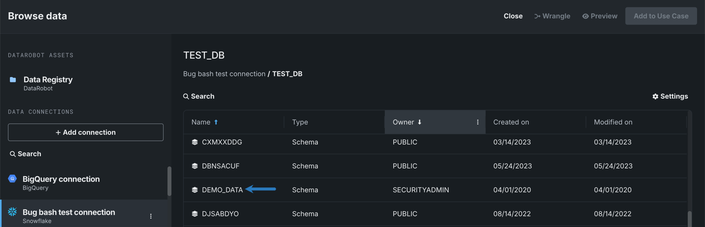 If you want to decrease the size of the dataset before adding it to your Use Case, click Wrangle. When you publish a recipe, you can configure automatic downsampling to control the number of rows when Snowflake materializes the output dataset.